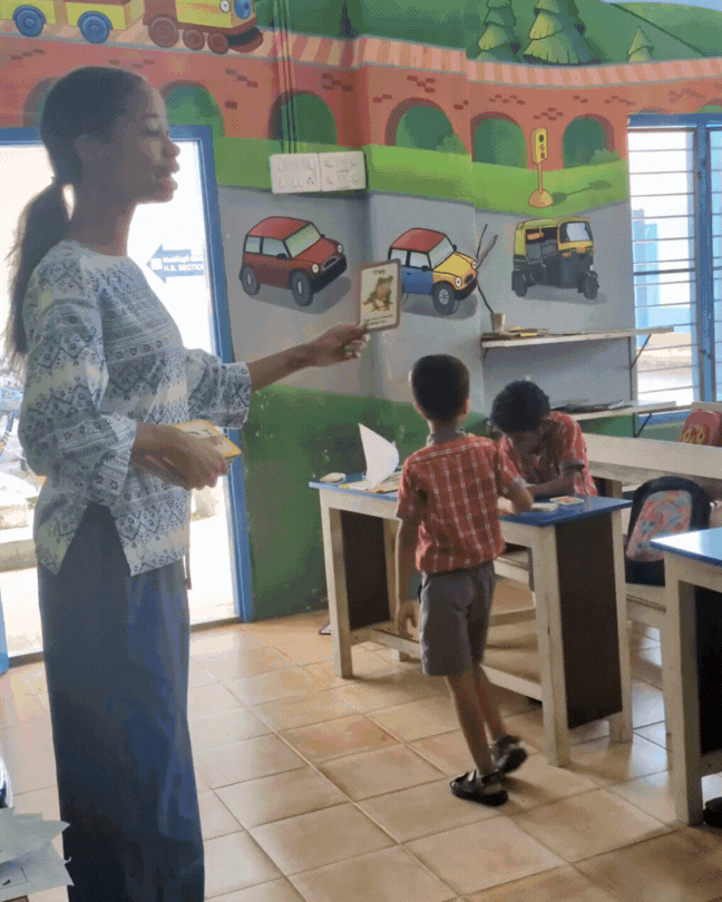 We teach English to 4 and 5-year-olds through songs and learning games.